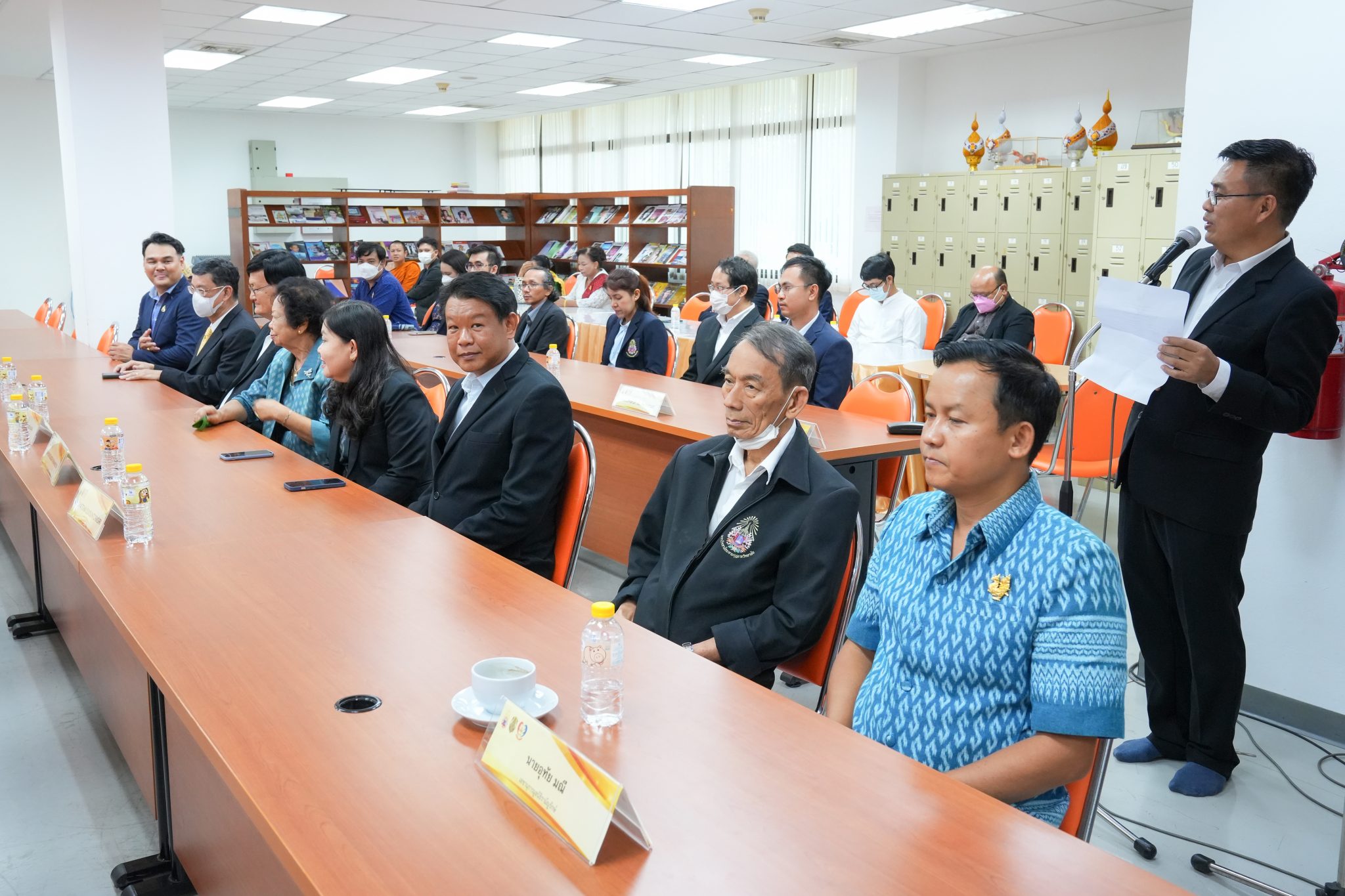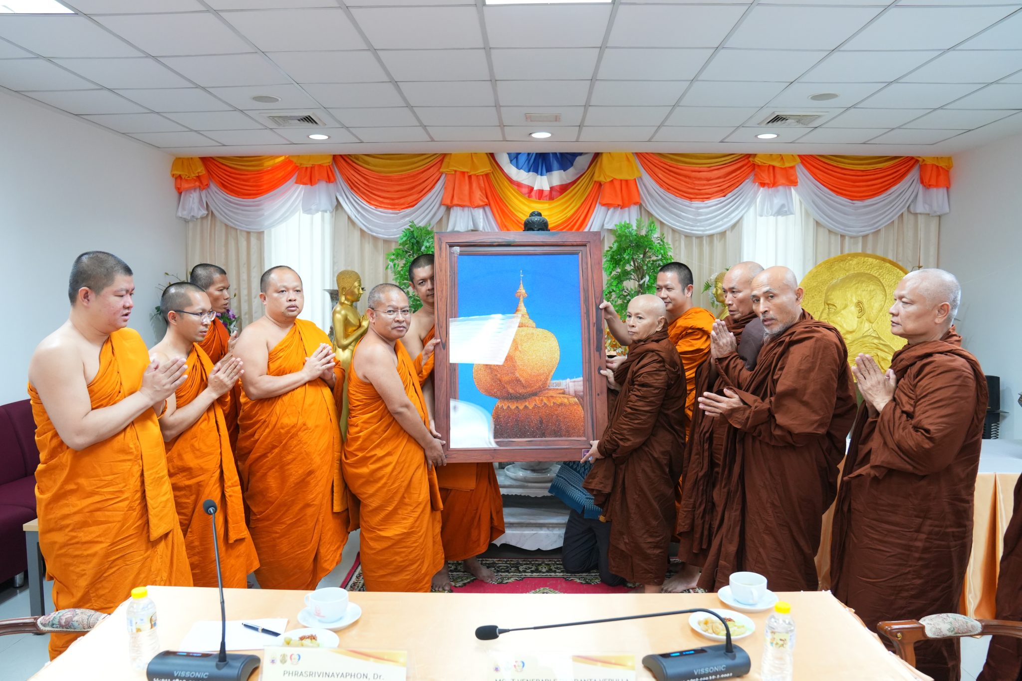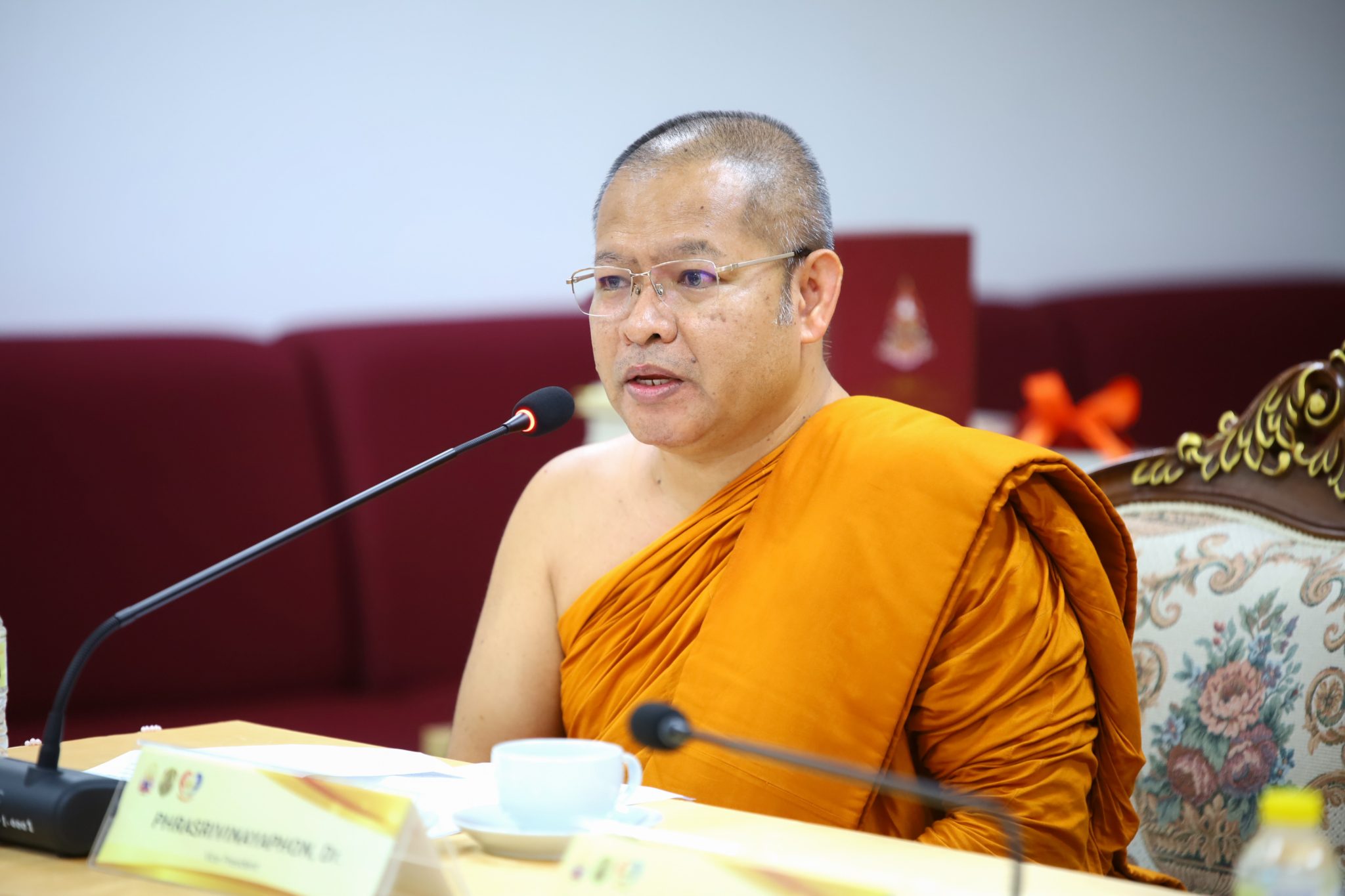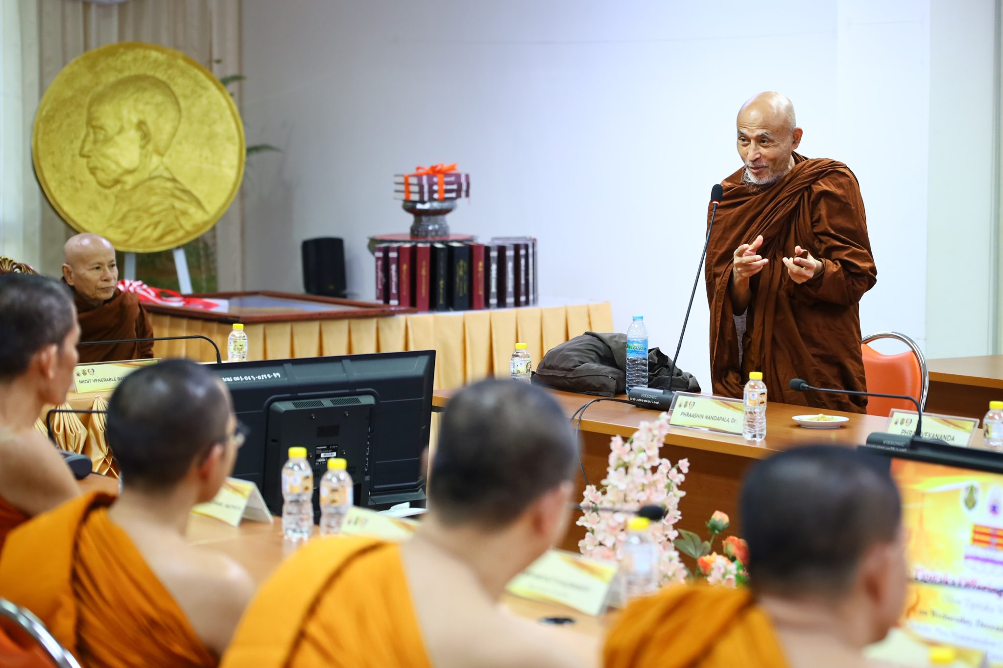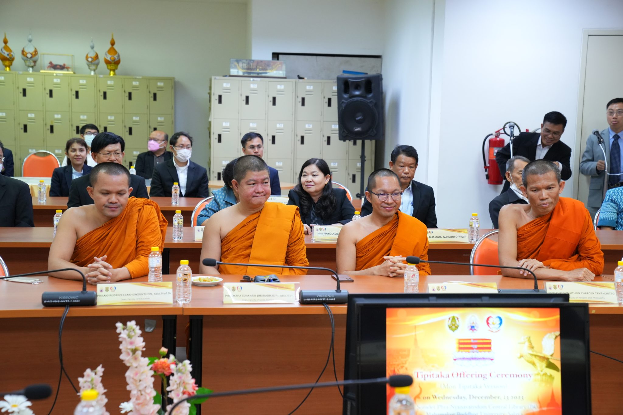 ในการนี้พระศรีวินยาภรณ์, ดร. รองอธิการบดี ได้กล่าวปฏิสันถาร และได้มีการแลกเปลี่ยนเรียนรู้ถึงประวัติการเผยแผ่พระพุทธศาสนาในธรรมยุติกนิกาย และความสัมพันธ์ระหว่างคณะสงฆ์ไทย และคณะสงฆ์มอญ “ในนามอธิการบดี มหาวิทยาลัยมหามกุฏราชวิทยาลัย ขอแสดงการต้อนรับและขอกราบขอบพระคุณพระมหาเถระทั้งหลาย โดยมีพระเดชพระคุณพระภัททันตะ เวปุลละ เป็นประธานคณะสงฆ์มหาเย็น รามัญธรรมยุต เป็นต้น ในที่นี้ ที่ได้นำพระไตรปิฎก ฉบับภาษามอญ ในฐานะสิ่งที่มีค่ามากอย่างยิ่งในพระพุทธศาสนามามอบให้แก่มหาวิทยาลัยมหามกุฏราชวิทยาลัยเป็นที่ทราบแล้วว่า พระไตรปิฎกเป็นสมบัติที่ล้ำค่าในพระพุทธศาสนา เนื่องจากเป็นการบันทึกไว้ซึ่งคำสั่งสอนขององค์สมเด็จพระสัมมาสัมพุทธเจ้า ในพุทธันดรหนึ่งจะมีเพียงหนึ่งพระองค์ที่ลงมาตรัสรู้ คำสั่งสอนทั้งหมดทั้งมวลนั้นได้รับการสืบทอดต่อเนื่องมานับเป็นเวลาหลายพันปี ตั้งแต่ที่เป็นแบบมุขปาฐะจนถึงมีการจัดพิมพ์เป็นรูปเล่ม