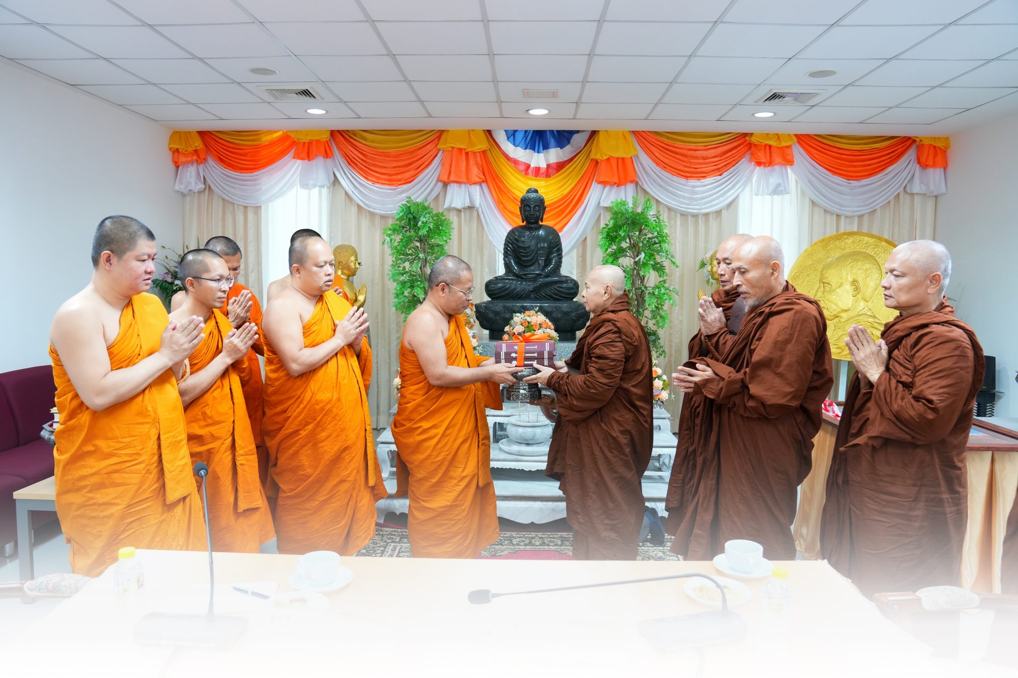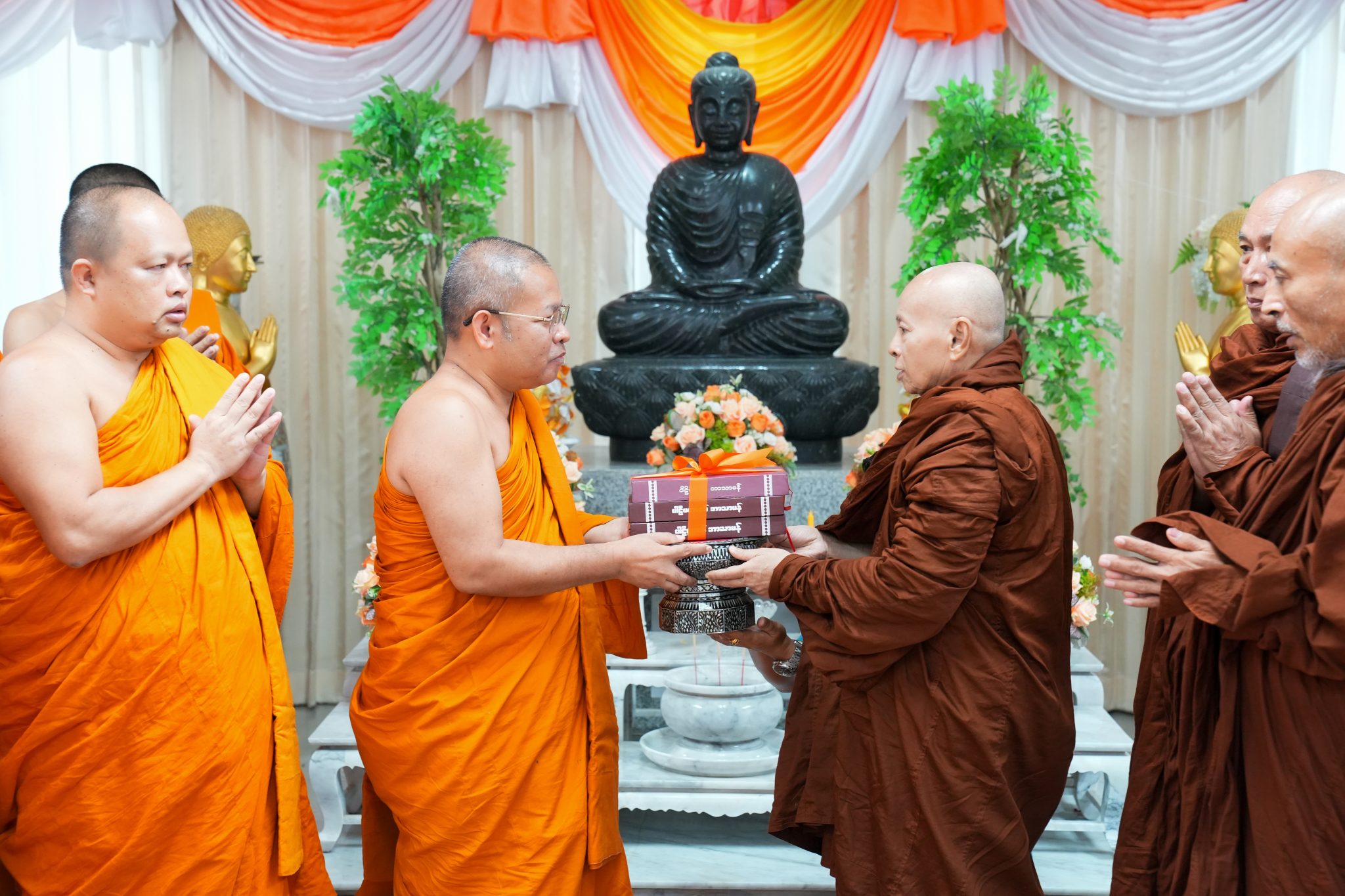 จากนั้น Most Venerable Baddanta Vepulla รองประธานคณะสงฆ์มหาเย็น (รามัญธรรมยุต) ได้กล่าวอนุโมทนา ที่อธิการบดี และคณะผู้บริหาร มหาวิทยาลัยมหามกุฏราชวิทยาลัย ได้ถวายการต้อนรับในครั้งนี้ โดยสรุปว่า ขอกราบขอบพระคุณท่านอธิการบดี รองอธิการบดี คณาจารย์ และเจ้าหน้าที่ทุกท่าน ที่เปิดโอกาสให้คณะสงฆ์ได้มาเยี่ยมเยียนสถานที่อันน่าตื่นใจแบบนี้ การมาเยือนมหาวิทยาลัยมหามกุฎราชวิทยาลัยของคณะสงฆ์มหาเย็นนี้ ครั้งนี้ถือว่าเป็นครั้งแรก เป็นครั้งประวัติศาสตร์ ซึ่งเป็นที่น่ายินดีอย่างยิ่งที่ได้มาเจอกัน นิกายมหาเย็นเกิดจากเมืองไทย มีรากฐานมาจากประเทศไทย การมาครั้งนี้เหมือนลูกหลานได้กลับมาเยี่ยมมาเยือนถิ่นบ้านบรรพบุรุษ หวังเป็นอย่างยิ่งกว่าอนาคตระหว่างคณะสงฆ์ทั้ง ๒ ประเทศคงได้ร่วมการทำงานเพื่อพระพุทธศาสนายิ่ง ๆ ขึ้น ๆ ขอขอบพระคุณด้วยใจจริงอีกครั้ง.. จากนั้นได้ทำการถวายพระไตรปิฎก ฉบับภาษามอญ แก่มหาวิทยาลัยมหามกุฏราชวิทยาลัย คณะสงฆ์ทั้ง ๒ คณะได้ร่วมเจริญชัยมงคลคาถา พร้อมแลกเปลี่ยนของที่ระลึก