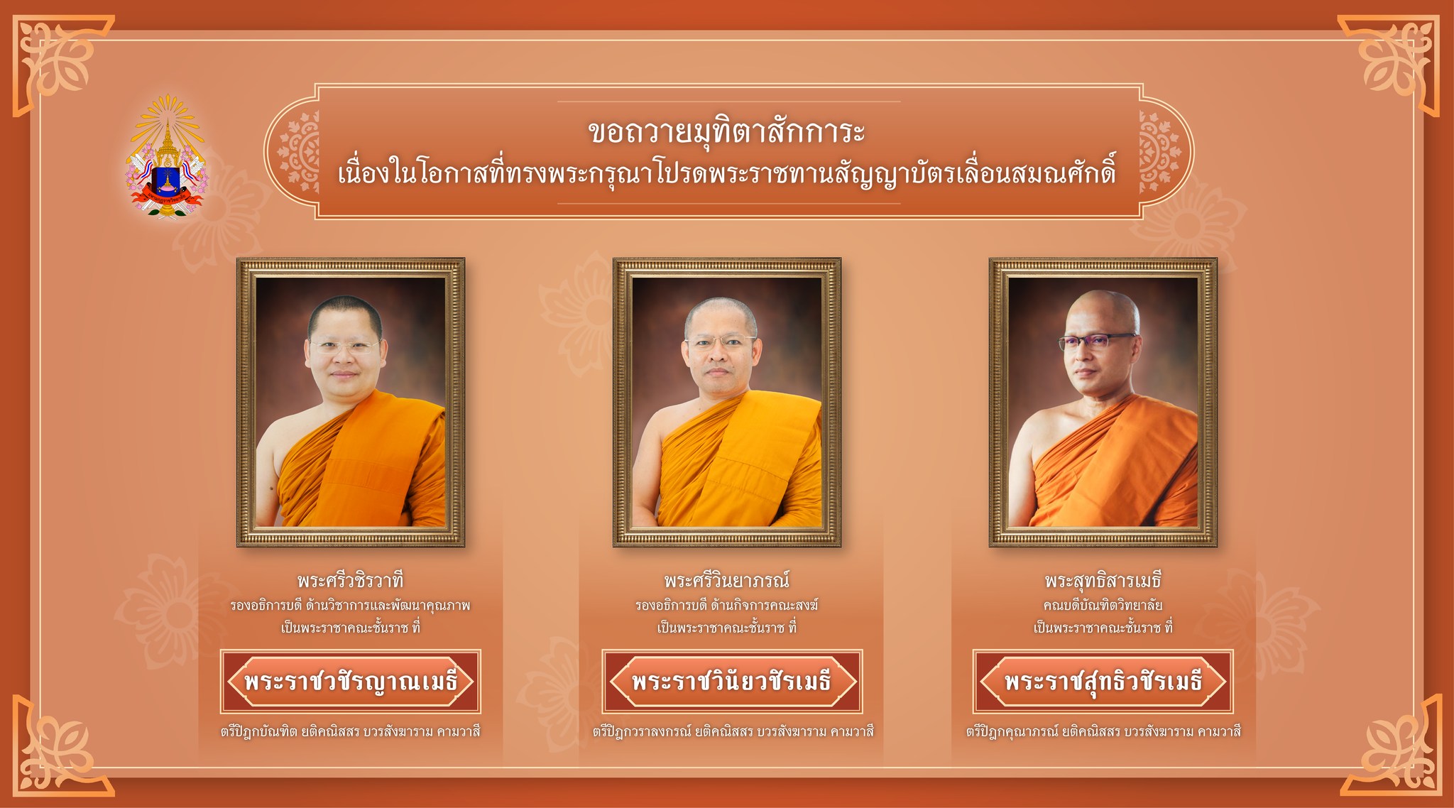 ๓. พระสุทธิสารเมธี (ชัยยันต์ จตฺตาลโย) คณบดีบัณฑิตวิทยาลัย วัดบุรณศิริมาตยาราม เป็นพระราชาคณะชั้นราช ที่ พระราชสุทธิวชิรเมธี ตรีปิฎกคุณาภรณ์ ยติคณิสสร บวรสังฆาราม คามวาสี