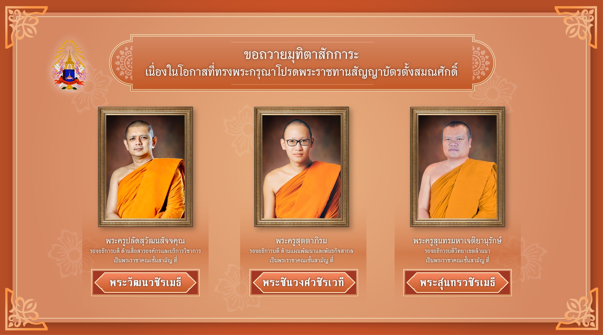 ๔. พระครูปลัดสุวัฒนสัจจคุณ (ธีรวิทย์ ฉนฺทวิชฺโช) รองอธิการบดี ด้านสื่อสารองค์กรและบริการวิชาการ วัดราชาธิวาส เป็นพระราชาคณะชั้นสามัญ ที่ พระวัฒนวชิรเมธี