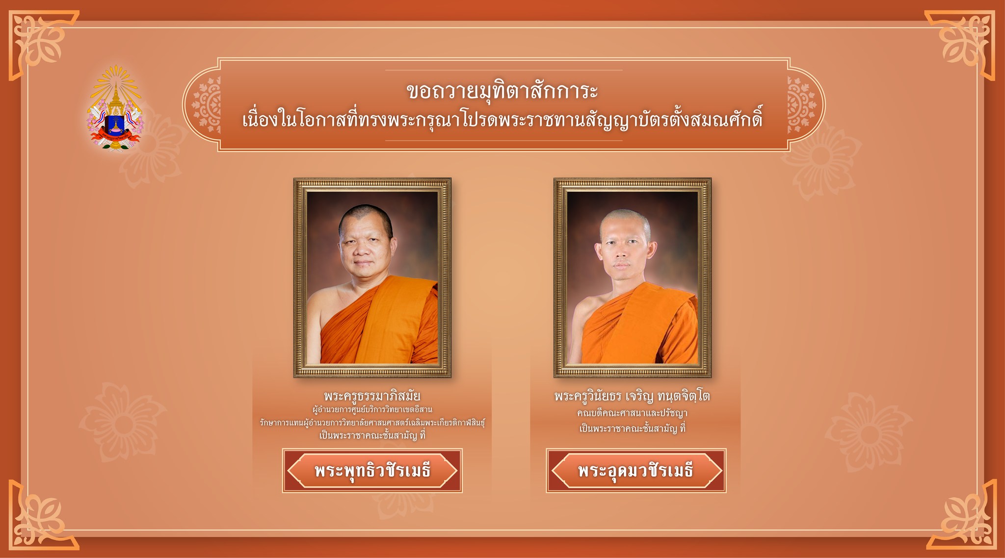 ๗. พระครูธรรมาภิสมัย (สมัย ผาสุโก) ผู้อำนวยการศูนย์บริการวิชาการ อีสาน รักษาการแทนผู้อำนวยการวิทยาลัยศาสนศาสตร์เฉลิมพระเกียรติกาฬสินธุ์ วัดศรีจันทร์ จังหวัดขอนแก่น เป็นพระราชาคณะชั้นสามัญ ที่ พระพุทธิวชิรเมธี